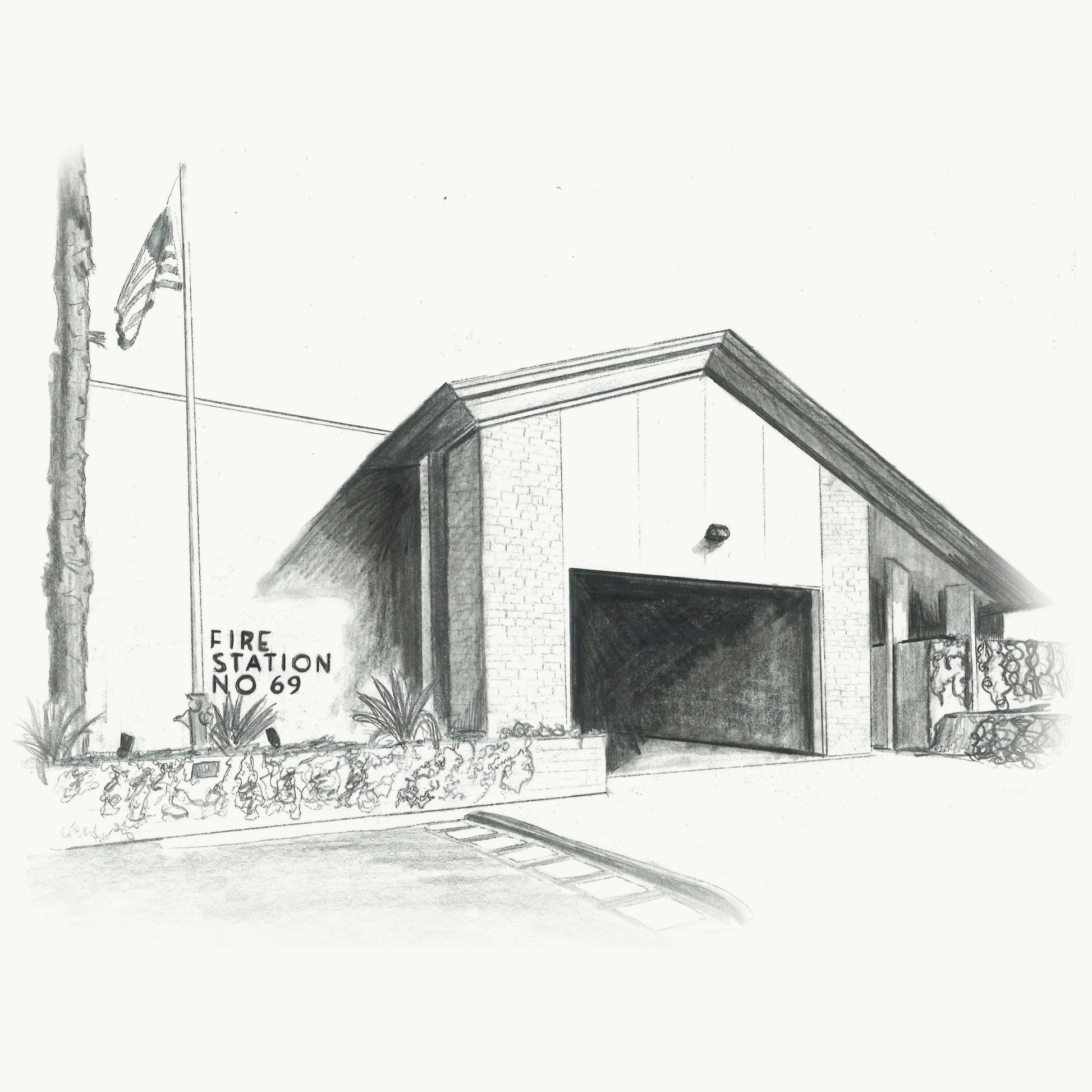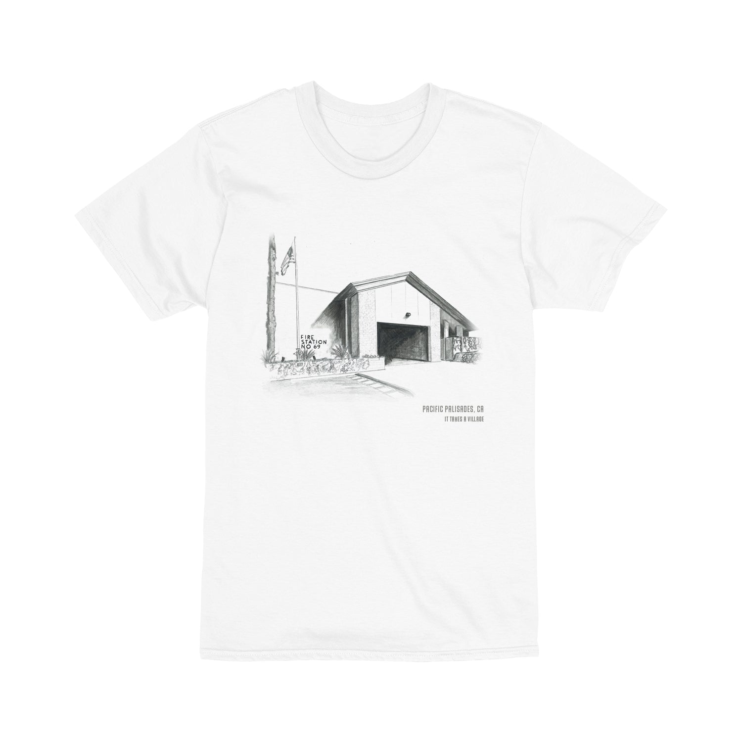 This Tee features a hand drawn depiction from a local LA artist of the Palisades Neighborhood Fire Station no 69.